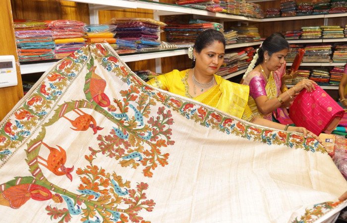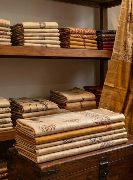 Hand-printed Tussar silk sarees showcase natural texture with artistic handcrafted prints. Ideal for traditional functions, festive wear, and elegant ..